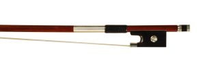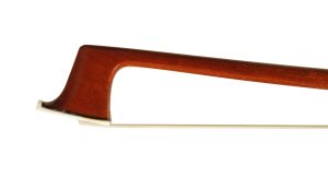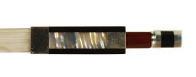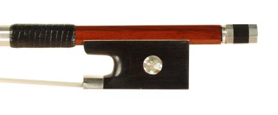 This bow is round in section, pernambuco, and sterling silver mounted. It has a strong head rising straight up and the facial is finished off in bone. The ebony frog has single mother-of-pearl eyes (7.0 mm diameter) with a full mount silver heel attached to the frog with pin work. To get a spot on match in the pearls the pearl eyes and the slide come from the same shell. The mother-of-pearl comes from Mexico. The winding is sterling silver wire with the thumb grip in black leather with a rolled pattern in the leather to give the appearance of costly exotic leather. The bow has nice balance; the sterling mounts in the ebony frog keep the weight towards the frog end making the rest of the stick feel light. The stick is handsome, has beautiful color, and is easy to control.