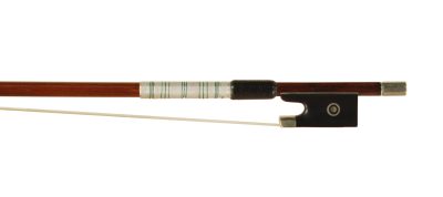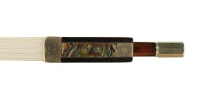 This Bausch workshop bow is from the late 19th or early 20th century, and it is a nickel silver mounted bow. I meticulously went over the bow, cleaning the stick after taking the old grubby winding and leather off. I replaced the winding with a silver tinsel with green silk as an accent, this was to ensure the overall gram weight stayed in and around 60.0 grams. A new silver winding in nickel wire would have pushed this bow up to 62.5 grams and offset the balance of the bow. The leather thumb is goat, and the frog sports a beautiful green/blue hue mother-of-pearl slide. The stick is well proportioned as the camber begins soon after the head. The tip area and tip of the bow as well as the frog are all original. This color is orange/brown, leaning more towards the brown and the stick is in round section. The tight grain is evident to the eye and has no flaws. The frog is a Parisian eye model nickel silver mounted in ebony. The lining is held in with a small bronze screw and the button is a solid nickel cap. The bow has German detail and craftsmanship and is easy to handle and create sound. The bow is fully restored and ready to be tried on your violin. A sleeper in our collection of bows. German quality, nice age, and a bow in great condition.