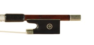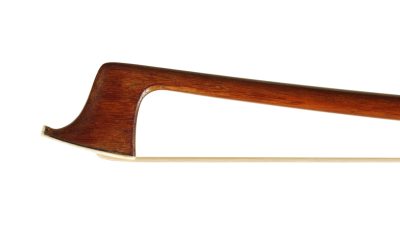 To meet the demand of bows, the bow industry developed and rose out of a remote area of eastern Germany near the Czech border, a region known as Western Bohemia. The center of the instrument making industry was the town of Markneukirchen in the state of Saxony. The Bausch family, makers from 1804-1875, were highly regarded and esteemed in the bow making area of the violin trade. Their bows were known for their outstanding hand work and playability. The family made bows for four generations, beginning with Ludwig Christian August Bausch in the 1820’s. They made superb bows sold as their own and marketed unstamped bows to other shops in Germany such as the Heinrich Knopf workshop. “BAUSCH” branded bows were still being made while the Bausch shop was under the management of the Otto Paulus family from 1876 up to the 1920’s. This bow was made near or just before the beginning of the 20th century. The stick has the BAUSCH name and Germany stamped on the butt of the stick too. The bow simply would have been placed in a violin outfit headed for sale at a music company. These older German pernambuco bows are excellent sticks with very firm wood.