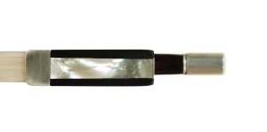 Our stick is a replica in Dodd style and 1-2 mm shorter than a standard modern violin bow. A Markneukirchen stick, not an English bow, yet showing many traits of an English Dodd bow. The head or tip of the bow is erect and almost a squatty hammer type of tip. The head is masculine in its appearance. The pernambuco wood chosen is tight grain, firm, and has a head that was handled a lot as well as the frog area. The bow has normal wear you would see on a 100 plus year old bow. The handling area, because of playing, has grown darker in its color because of the natural playing wear. The rest of the bow has an orange/brown color and the stick is round section. The frog is sterling silver mounted with a full-length mother of pearl slide and a heel of sterling silver. The heel and lining are affixed to the ebony frog with pin work. The winding is the original as I found the bow, a real whalebone winding with a new goat thumb leather. The frog is a Parisian eye model. I replaced the pearl eyes, and the end button has a solid silver cap with a double turn in the collar. The bow is in very good condition and is a player. Someone took care of this bow and used it to boot. A great stick, easy feel worn beautifully, and the bow is ready for another generation, all restored and ready to find a new home.