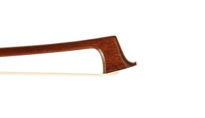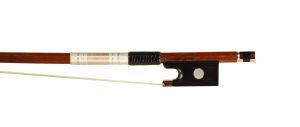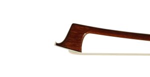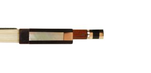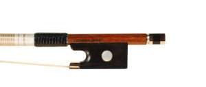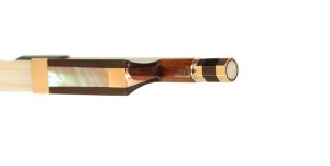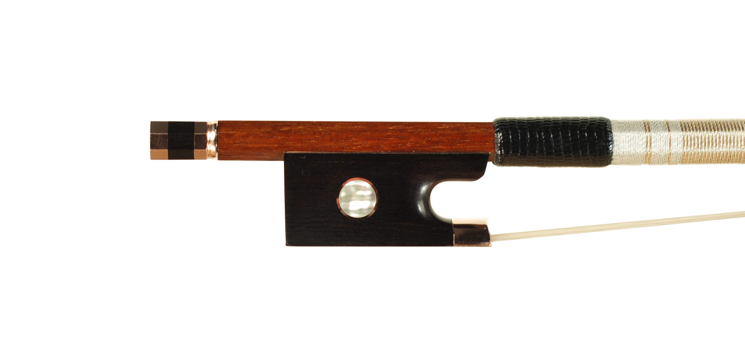 This fine gold mounted violin bow is handmade by F. Correira in 2025. He lives in Brazil (American Spelling,) and works under the umbrella of the fine workshops of Arcos Brasil, LLC where 11-12 bow makers work for them. The bow is a Special Edition gold mounted bow made of Ipe wood. The Ipe is in round section, comes from Brazil, and for this stick is choice. It is firm and plays exceptionally well. For me it handles everything: off the string articulations and it brought out the bottom end of violins easily, no effort. The bow is balanced and totally easy to play with. The tip of the bow is erect, very masculine in style. The knife work in the chamfers is right on and carries slightly into the stick itself. The color of the stick is a deep orange/brown, oiled after the stick is incremented, and finished and done before the frog is fitted and then haired. The frog is handmade, gold mounted, and features a large mother-of-pearl eye surrounded immediately by a .9 mm gold ring. The workmanship is beautiful to see. The gold heel and lining are held in place by fine pin work, no screws. The frog is Arcos Brazil’s own model with the large 8.0 mm eye center on the frog. Correia’s jewelry work and bow calibrations are spot on. The bow feels awesome in the hand. The pearls in both eyes and on the slide have an array of color. The winding is silver tinsel mixed with a gold tinsel winding captured at the frog end with a lizard leather thumb grip. The frog finishes out with a three-piece gold/ebony/gold button completed with a pearl eye on the end of the button. This is a bow any serious player will want to try and possibly add as an investment, not only as an option for creating sound.