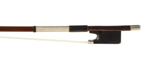 The bow received extra cleaning and a new bone tip. I saved the sterling silver winding but replaced the thumb grip and lapping that encapsulated the silver with goat leather. The tip is erect, with a gorgeous nose and strong back to the head. The frog is original, called a blind eye ebony frog. It is a half-lined frog which is old, beautiful, classy, and very well executed by the maker. The frog is slightly smaller than a 20th century maker’s frog in its width, but the maker added a couple of millimeters of length to the frog. The frog has natural wear and feels fantastic in the hand. The lining in the frog is held in place by two very small silver pins. The button is solid silver cap with one turn in the collar. The pearl slide is white abalone, traditional for the period. This is an excellent bow for the serious player, fully restored, ready for another 140 years.