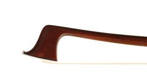 The skill of workmanship is evident in this bow that is octagonal in section and pernambuco. The wood is choice, and the red/brown color is consistent throughout the entire bow. The stick is firm, which is the strength of the bow, and octagonal in section with the camber starting 6.0 cm from the tip if the stick. The head of the stick has a new tip completed in bone, also a new sterling silver winding and leather. The ebony frog is sterling silver mounted, and the heel round is one-piece. The bow is finished with a three-piece silver and ebony adjuster. I gave the bow a good cleaning, silver polished, and fresh hair. The bow is in great condition and getting close to a century old. Beautiful Markneukirchen work.