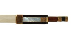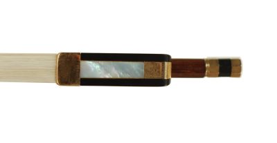 The stick has some guts and the bow handles very well. A bow with bronze fittings The wood is choice in its grain and color. Old stuff that must have been laying around and/or hiding in someone’s workshop or barn. I went over the entire bow giving it a good cleaning and replacing the winding with some older style whalebone winding I had in my collection of windings. Also, I gave the stick a new leather thumb grip. The tip is all original and in great condition, as is the whole bow. The stick is pernambuco, round in section, and the frog is mounted in bronze fittings. I wish it was gold. The mounted frog flanges out at the base. I like it. It give a player a different feel. The frog is also rounded at the heel. It is a Parisian eye model with subtle pearl eyes and a little color in the mother-of-pearl slide. The lining is held in place by two pins and there is pin work in the heel as well. The bow is finished off with a three-piece end button, with a pearl end and a double turn in the collar. Yes, a good stick for the price.