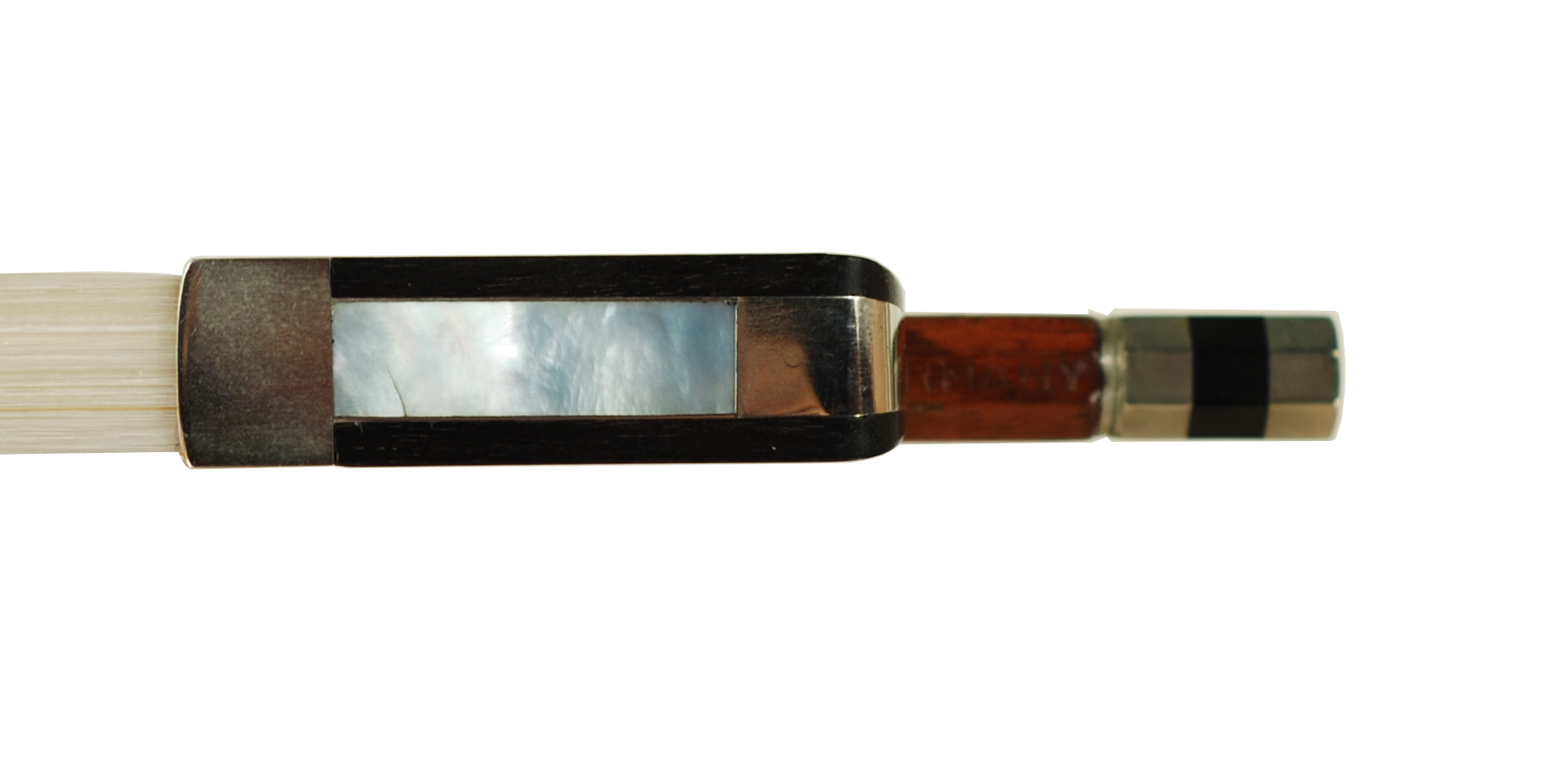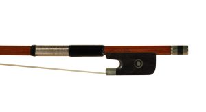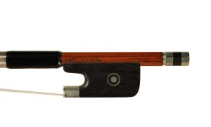 It is an excellent cello bow made with German detail in octagonal section and mounted in nickel silver. The winding, frog, and end screw are original to the bow. The stick is older growth, tight grain pernambuco with well thought out increments. The octagonal cut helps create a firm stick and a strong camber. I cut a new facial at the tip in casein material and it is the only part that is not original to the bow. The frog is ebony with a Parisian eye look. The eyes around the pearl are 2.0 mm wide, and the pearl slide is encased in nickel. This extra work is not usually done on a trade bow. The maker took his craftsmanship up a couple notches as even the frog shows pin work on the heel and in the lining. The bow is in very good condition and is easy to handle. Firm stick, German workmanship, older pernambuco wood, well made.