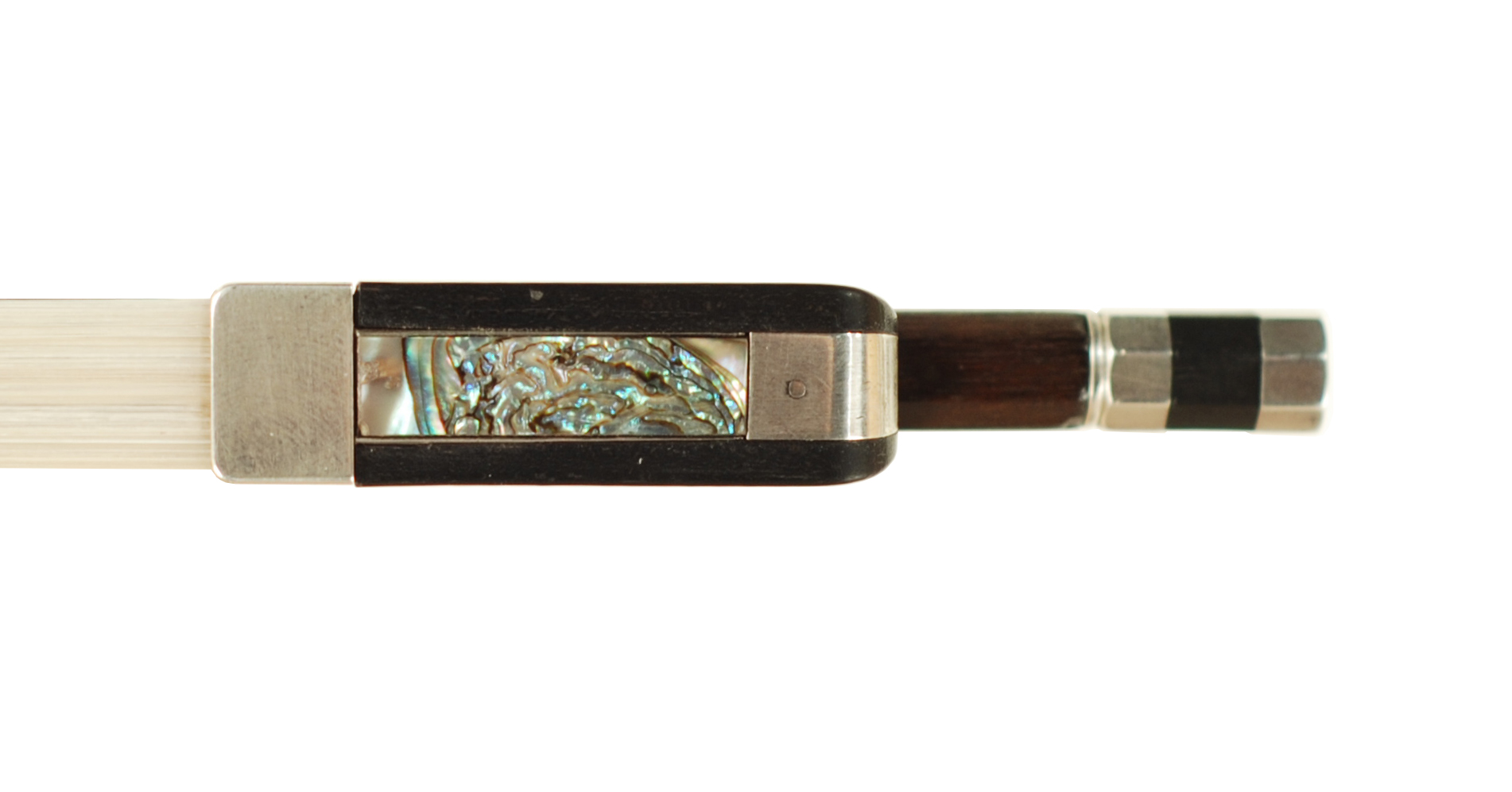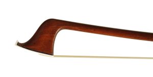 The bow is in fantastic condition, no issues: pernambuco, choice wood, round in section, and mounted in sterling silver. I cannot decipher the makers name and there are no markings of country of origin on the bow either in the typical places. The stick is strong in its formation, with tight grain from a slow growing dense tree. The entire bow shows fine craftsmanship. The head of the bow has a strong point that sweeps back gradually to the back of the head. The back of the head has perfect knife work in the chamfers that I love. The chamfers in the head extend back a few millimeters into the throat of the stick where you can see it blend into the round section of the bow. The head needed a new facial tip replacement and was the only thing that needed to be restored on the bow. The bow has a gradual camber. It is thinner at the head area and transitions to a very gradual taper, never getting overly wide or too thick. The bow is well thought out and is a study in incrementation from the tip to the very end at the button.