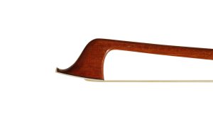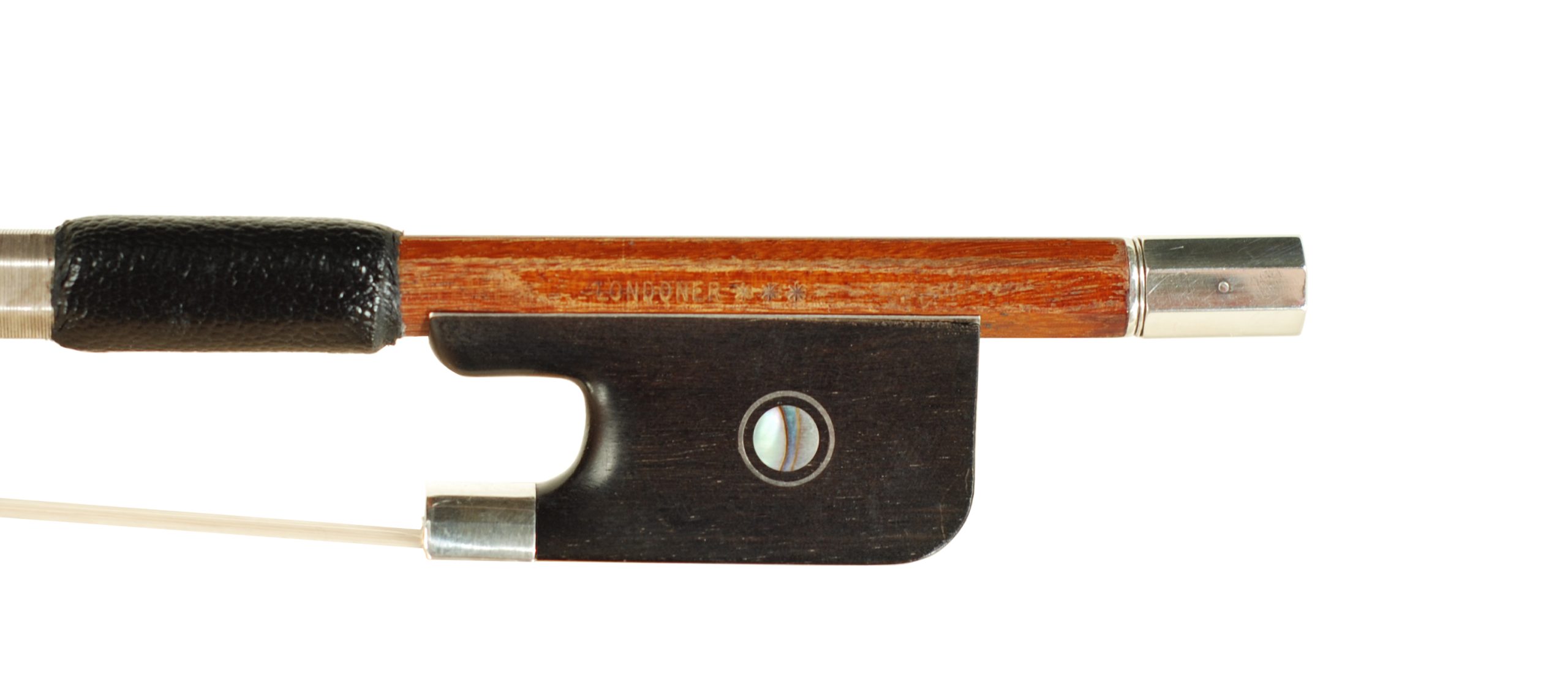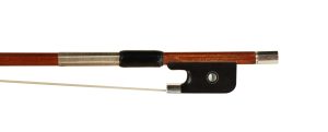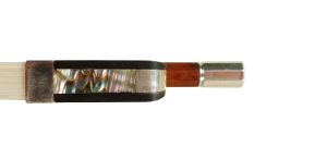 We have a sterling silver mounted Londoner cello bow. This bow is made in central China by the Luoyang JinQue Musical Instrument Company. It is one of their higher-level cello bows. The bow was made in 2015 and is pernambuco, sterling silver mounted and completed in an octagonal section. It is a firm bow, which is great for a player, and will play extremely well for an intermediate player. The frog is sterling mounted with a striking mother-of-pearl slide and two pearl eyes surrounded by silver. The heel, silver button, and the lining are secured to the frog with excellent pin work. Well done by the maker. The silver work is outstanding, and the stick has been finished with a great amount of detail. The button is a solid silver cap, and the tip is bone. I have given the bow thorough cleaning and polishing and a new leather thumb grip. The bow is in very good to excellent condition and is ready for the next player’s quiver. This would be a fantastic bow for an intermediate student looking to get into a sterling silver mounted pernambuco cello bow. It is a strong player assisted in firmness by the octagonal carving. This bow stands out at this price and can easily rival a German or Brazilian cello bow in the $1200 – $1395 range. Don’t let the fact that this bow was made in China dissuade you. There are some very fine craftsmen there. I can attest to that fact. This is a well-made bow, sterling silver mounted. Mr. Judd highly recommends trying this cello bow for an intermediate player.