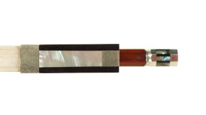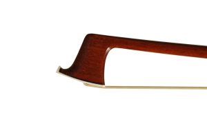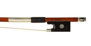 This bow was made in Portugal by Marcos Pereira. Marcos has been involved in the bowmaking trade since 1984 and is known worldwide for his affordable professional quality bows. The campeche has a higher quality piece of wood with a slight reddish tint and is made in round-section. The mounts, winding, and adjuster are all sterling silver. The fully-lined ebony frog features mother-of-pearl for the Parisian eyes, part of the lining, and the slide. A leather thumb grip and octagonal silver adjuster finish off this bow. The adjuster has mother-of-pearl on each facet between the silver ends. An advancing player, conservatory student, or professional will find a lot to like in this bow.